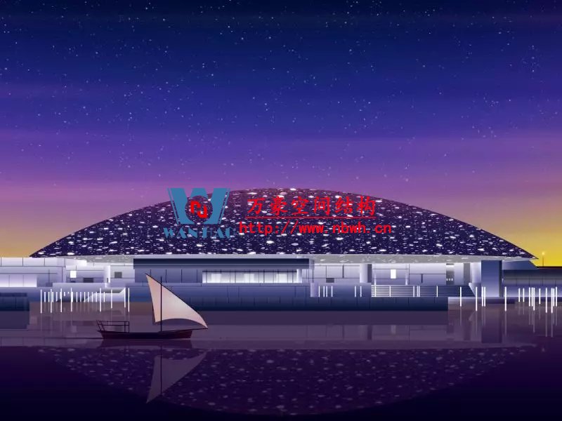 阿布扎比卢浮宫创造的是一个沉静而亲切、充满了光影和映射的空间。直径达180米的巨大圆形穹顶,覆盖了整个建筑主体。穹顶包含了四个不锈钢外层、四个铝制内层,其总重量与巴黎埃菲尔铁塔相同。
