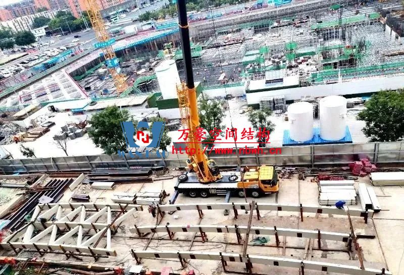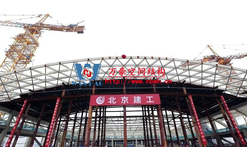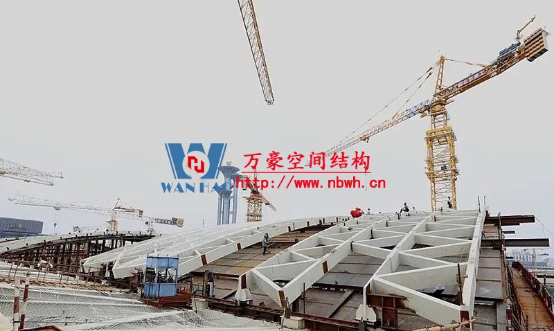 正在滑移施工的钢屋面网壳用钢量约2800吨,南北长168米,东西跨度72米,钢屋盖网壳面积大,距离地面高度为44米-52米,高空作业量大,构件吊次多达3000次,吊装时间约2个月,工期紧,钢结构焊接精度和质量要求极高,屋盖网壳为索承结构,控制变形难度大。