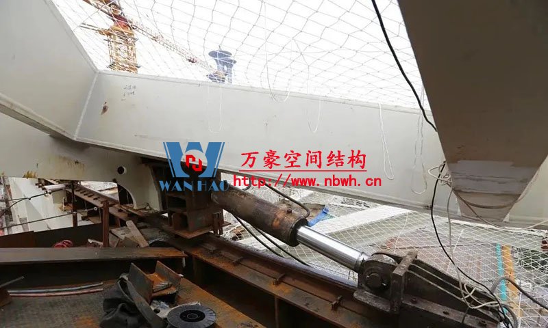 滑移前,事先设置滑轨,钢桥两端各安装1台-2台液压千斤顶和同步传感器,从2个平台分别向两侧顶推滑移,每滑移6米要进行钢索张拉,确保屋面结构稳固,最终将屋盖滑移到设计位置。