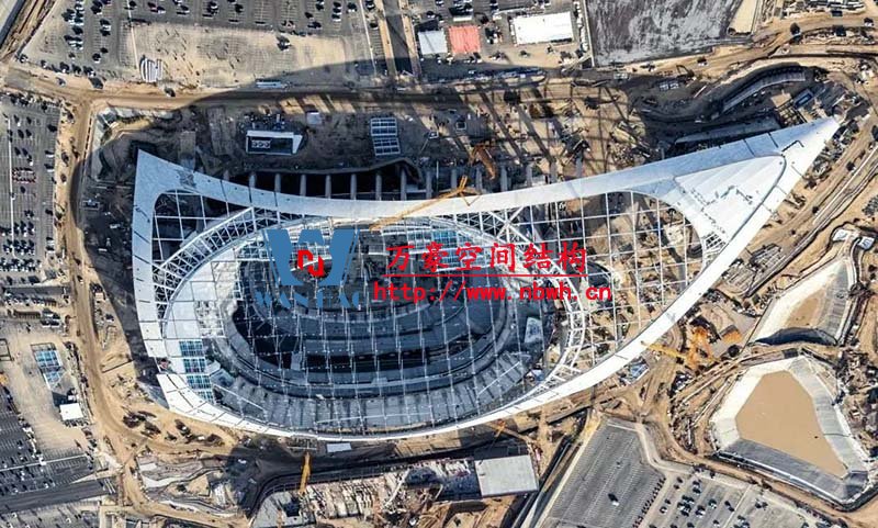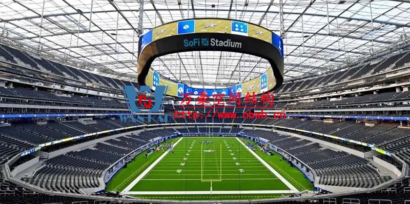 新球场名叫SoFi体育场,是Social和Finance头两个字母的组合。球场和周边设施总占地120万平米,总耗资超过350亿元。设有70240个座位, 总共能容纳超过10万人。建成后将成为NFL最大的体育场。