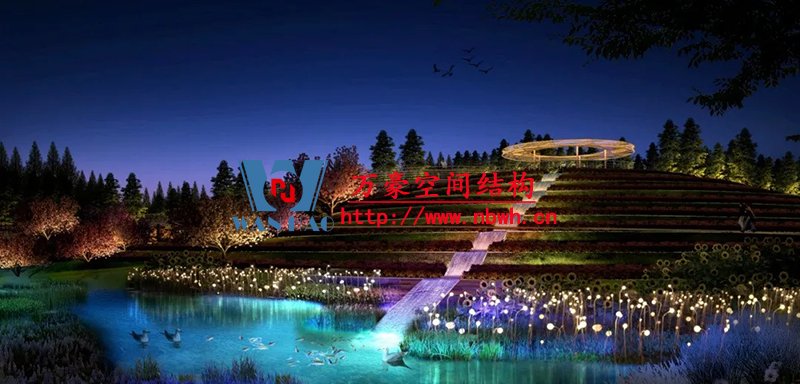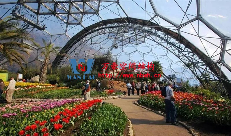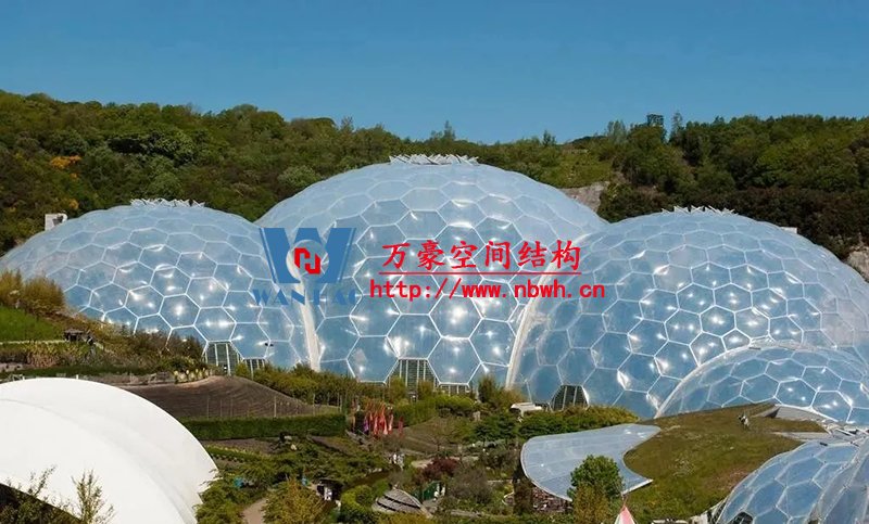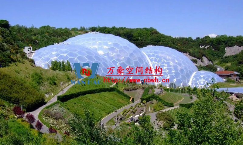 为了满足室内植物的采光条件,该馆穹顶全部采用轻盈的ETFE膜覆盖,“三膜两腔”的膜结构充气后就像一个巨大的泡泡,通过充气量的多少来调节室内温度,从而营造一个节能、环保、可持续的热带植物 “成长乐园”。