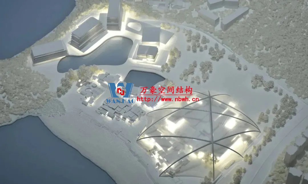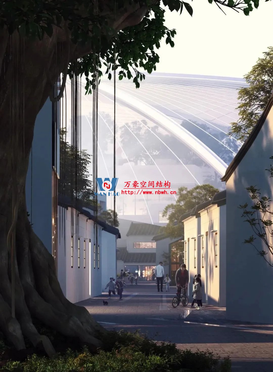 穹顶是对过去的封存,同时也是对未来的想象,穹顶最高点45米,采用了主拱和索膜结构,以确保其稳定性。穹顶由半透明的膜材料组成,仿佛一层薄雾般的穹顶漂浮于村落之上,与天色相融,虚实相间。