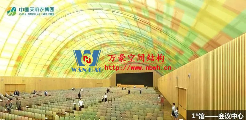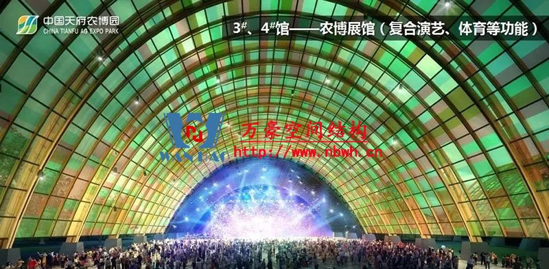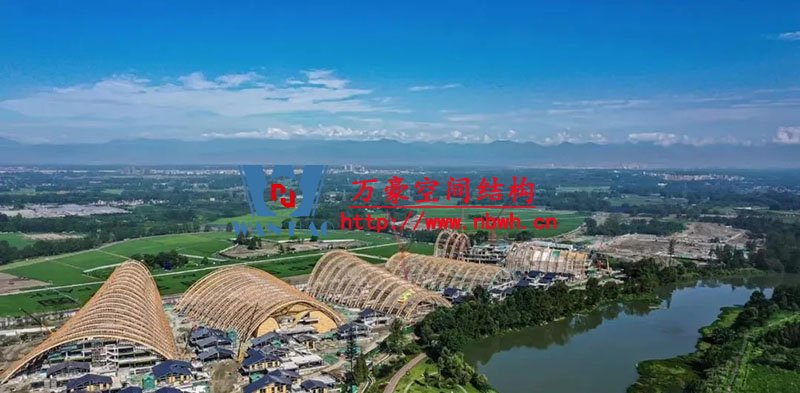 主展馆项目采取世界首创的钢木混合空腹桁架拱(钢木结构),整体为CNC加工木拱+单层ETFE膜结构体系,这座长在田野中的巨型建筑,在工程技术上运用了许多在成都,乃至国内都少见的高新技术、高级材料。