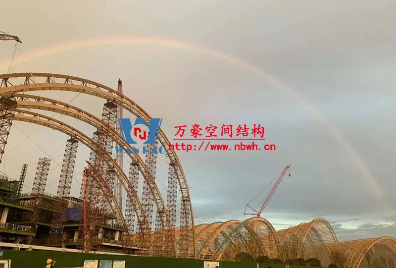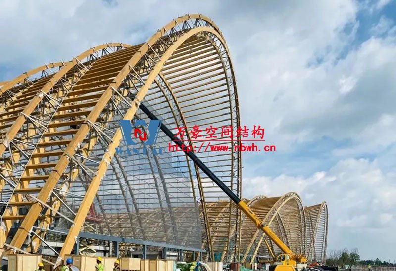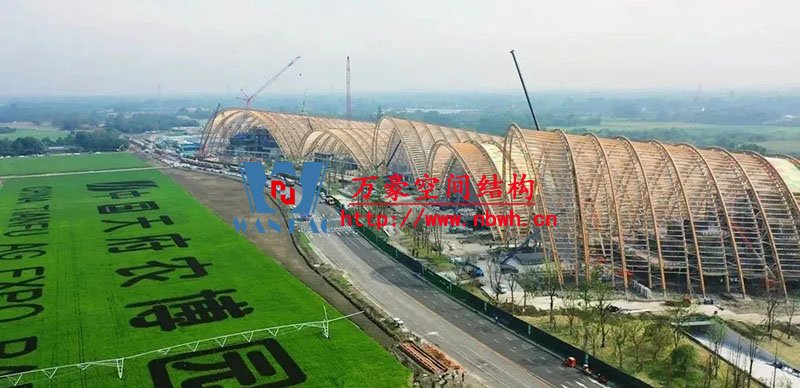 农博主展馆项目五个馆,共有77个巨型木拱,跨度高度均不相同,节点类型繁多,设计难度大。其中最大一拱跨度为118米,最高为43.25米。目前天府农博主展馆项目已经雏形初现,远远望去,犹如稻浪翻涌起伏震撼人心。