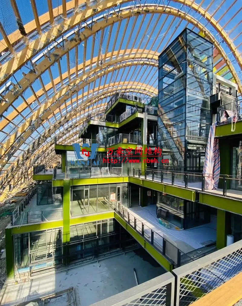 据了解,木结构原材料是来自欧洲高寒地带的落叶松和云杉,在奥地利、瑞士工厂采用CNC数控机床加工成成品,其材质强度高、坚固耐用。钢木结构的组装采用变截面胶合木作为拱形桁架的上下弦杆,和锥形钢腹杆共同形成三角形截面的拱形桁架。利用天然木材的肌理,通过结构展现建筑的表现力。