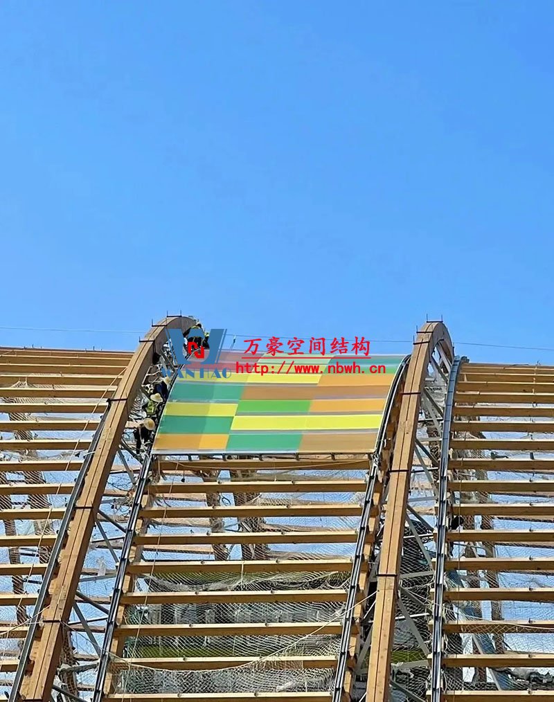 屋面为德国进口ETFE膜,这种膜的承重能力强,仅仅0.25毫米的厚度。膜片数量多、颜色多,通过采用参数化建模技术、加工图数字化自动出图等措施,达到设计规则统一、安装快捷高效的效果,最终呈现五彩斑斓的表面,表达积极、健康、丰收的景象。