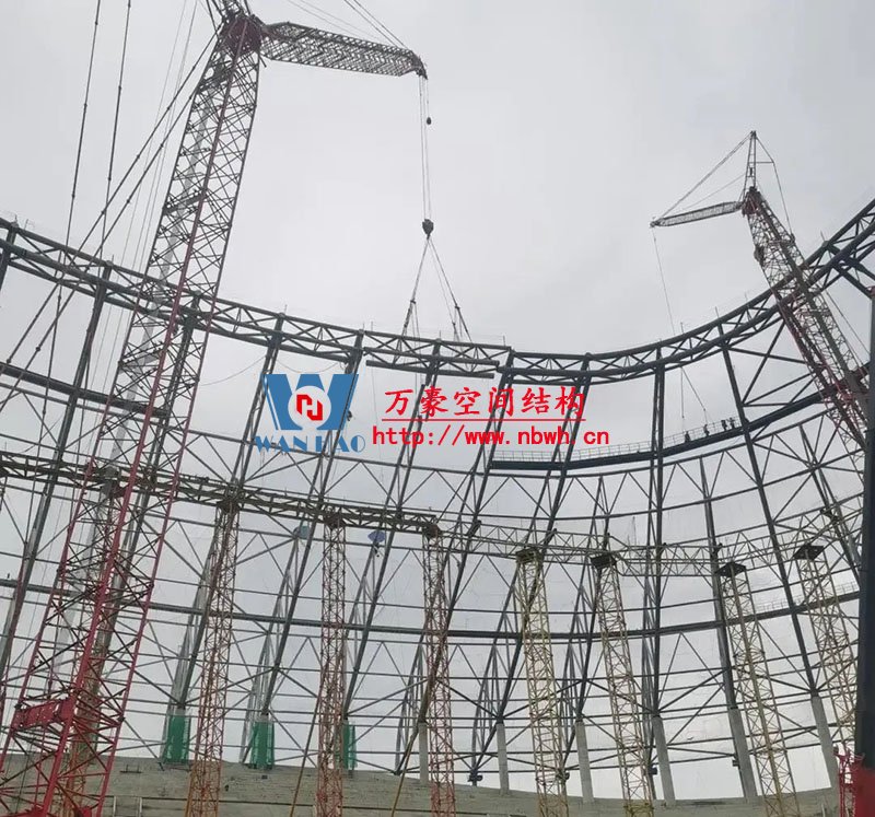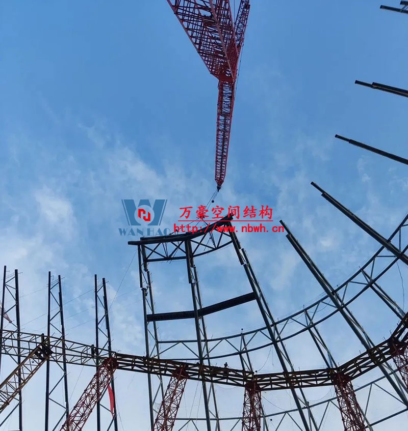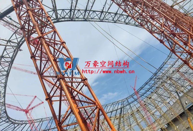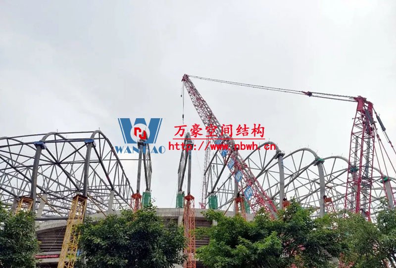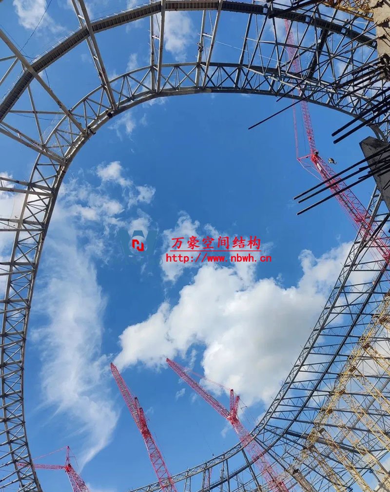 重庆龙兴足球场占地面积约303亩,总建筑面积约17万平方米。足球场钢屋盖平面呈椭圆形,南北投影长283米、东西宽252米,屋面最大高度59.5米。钢结构总重量1.4万吨,采用悬挑钢桁架+立面单层曲杆承重形式。立面为满足建筑简洁通透的效果,采用68根矩形曲杆与一道水平环向杆构成立面单层网格,为屋盖提供外环多点支撑。径向桁架与环向杆件交织,编绘起足球场绚丽外观结构,足球场雏形已呼之欲出。 钢罩棚平衡区长度27m,内部主桁架悬挑长度最大达58m。悬挑部分位于看台上方,安装高度高达59.5m。单榀桁架最大单重55t,单根钢柱重量达60t。 历时112个日日夜夜,68榀主钢结构桁架吊装全部完成。平均每榀桁架从进场、拼装、吊装、焊接,全过程用时仅一天半,比原计划提前12天完成节点目标。