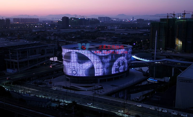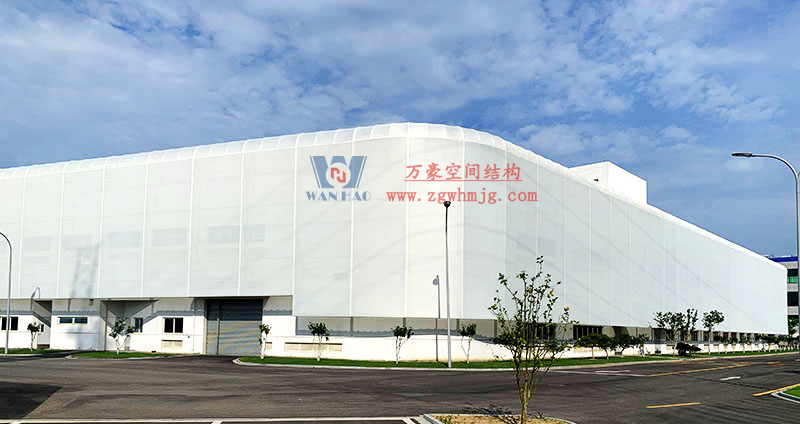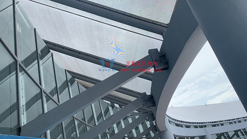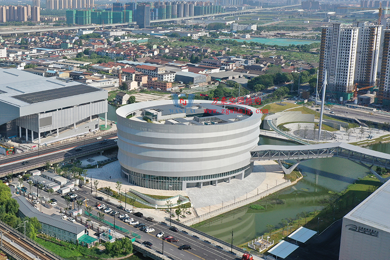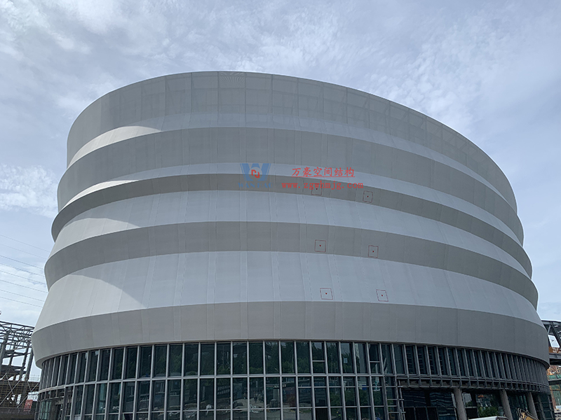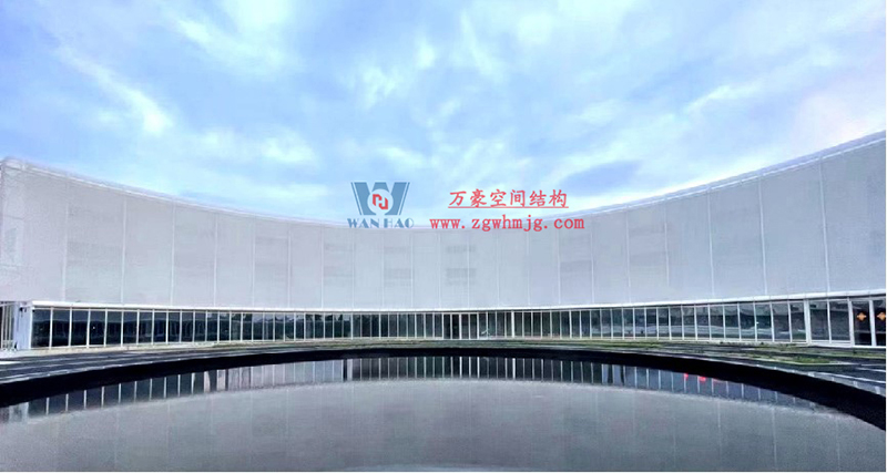 由万豪承建的绍兴国际会展馆中心外立面网格织物膜,由5凸5凹不同标高的柔线组合成飘丝带,视觉效果极具冲击力。