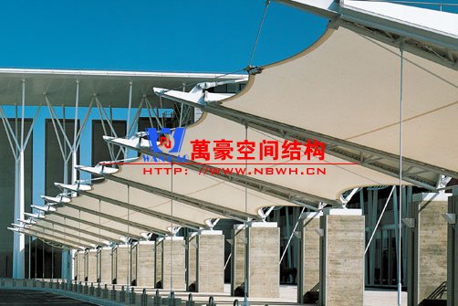 建筑入口使城市公共空间与建筑空间相邻的界面,成为城市空间的组成部分。它是人们视觉最先接触的部分,因此,除了功能以外,还应有很强的标识性,并能体现建筑的个性,是建筑环境和城市景观的重要组成部分。由于景观张拉膜独特的造型是其他结构类型无法比拟的,故成为近来建筑入口经常采用的形式。