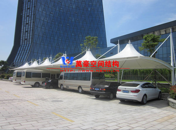 从小区到商业街区,我们都能看到各式各样的停车棚,从结构、材质上我们可以将常见车棚分为三大类:1、彩钢瓦车棚2、阳光板车棚3、膜结构车棚。其中膜结构车棚越来越受到业主欢迎,这是因为膜结构车棚具有很多的优点:造型独特、强度高、耐腐蚀、抗老化、透光性佳、自重轻安全性高等等,而且膜结构车棚都是工厂加工然后现场安装,所以施工周期短。规模较小的车棚几天就可以完成,对场地要求不高,狭窄的空间也可以施工,对于周围居民影响小,同时膜结构车棚所用的膜材具有较强的自洁能力,依靠雨水的冲洗就能持久如新,这也大大减少了维护频次,正是由于这么多优点,膜结构车棚大有取代传统车棚的趋势。