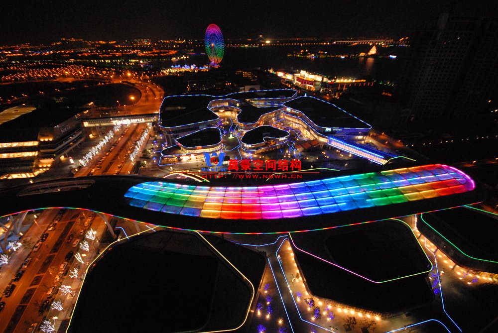 空间膜结构是一种全新的建筑结构形式,它集建筑学、结构力学、精细化工与材料科学、计算机技术等为一体,具有很高的技术含量。其曲面可以随着建筑师的设计需要任意变化,结合整体环境,建造出标志性的形象工程。
