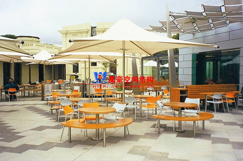 2.商业街膜结构遮阳棚,一般都安装在商业街内部,给逛街的休息的人提供遮阳作用。