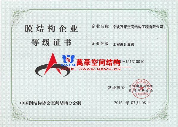 从公司资历和硬件配备上来讲,宁波万豪空间结构工程有限公司成立至今已有11年,注册资金5001万,是目前国内高端膜结构技术公司之一。万豪厂房面积30亩,厂区建筑面积共计16000平方米,标准大跨度车间6000平方米,设有膜材加工车间,检测车间,钢结构精加工车间,钢膜专业生产加工设备80余台套。企业年生产能力:膜结构50万平方米/年度,钢结构10000T/年度,年产值1.5亿/年度。