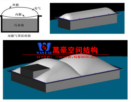 在反吊钢支撑的基础上,膜结构企业又开发了另一种污水池封闭技术,就是内外膜气罩封闭,即双膜气罩,这就如污水池上盖了一个气囊,它由气密性极强、撕裂强度极大的膜材料焊接而成,通过四边与污水池池壁的锚固,形成一个稳定的受力结构,从而将污水池池内恶臭气体封闭在一个相对较小的空间里,降低除臭风机的抽风空间,降低用电量。这就是污水池膜结构气罩封闭技术。