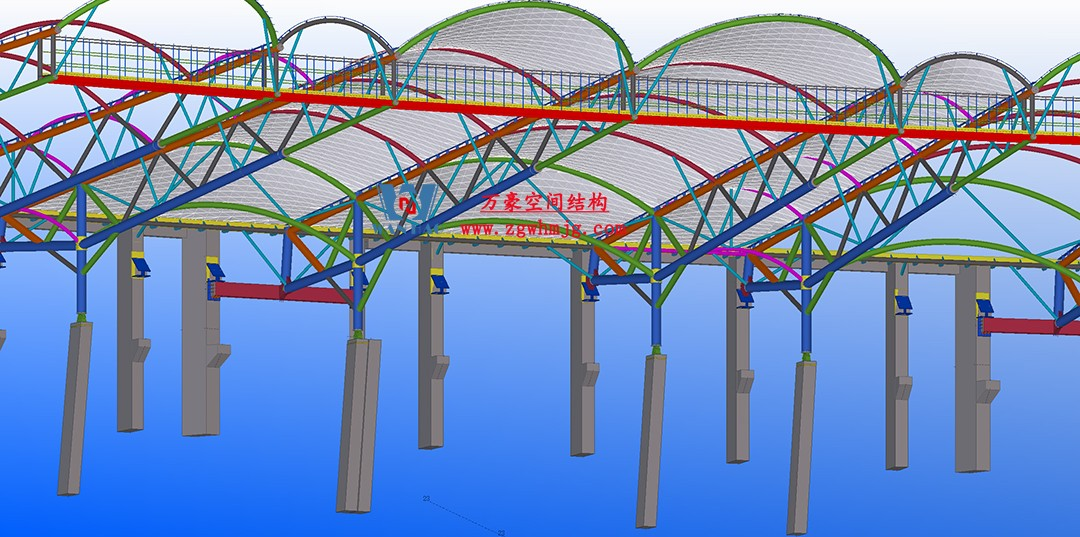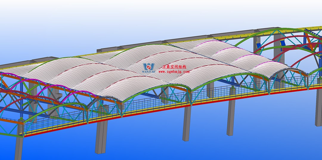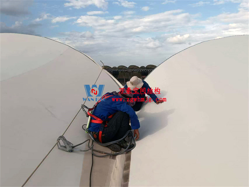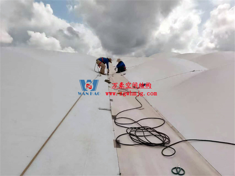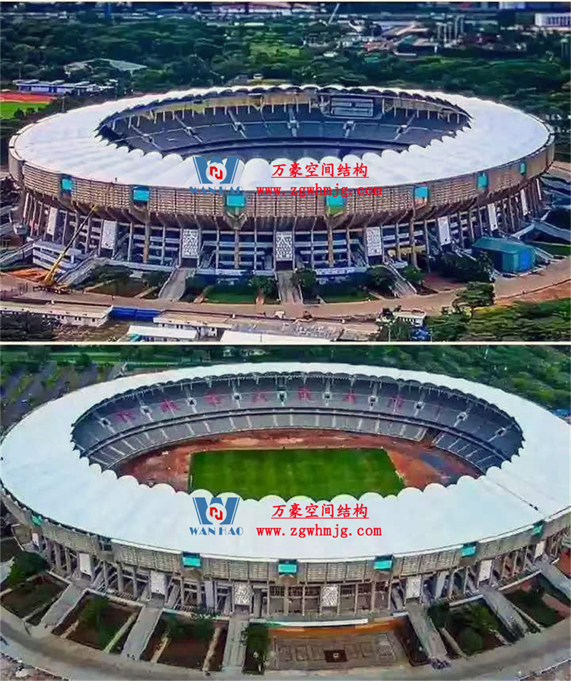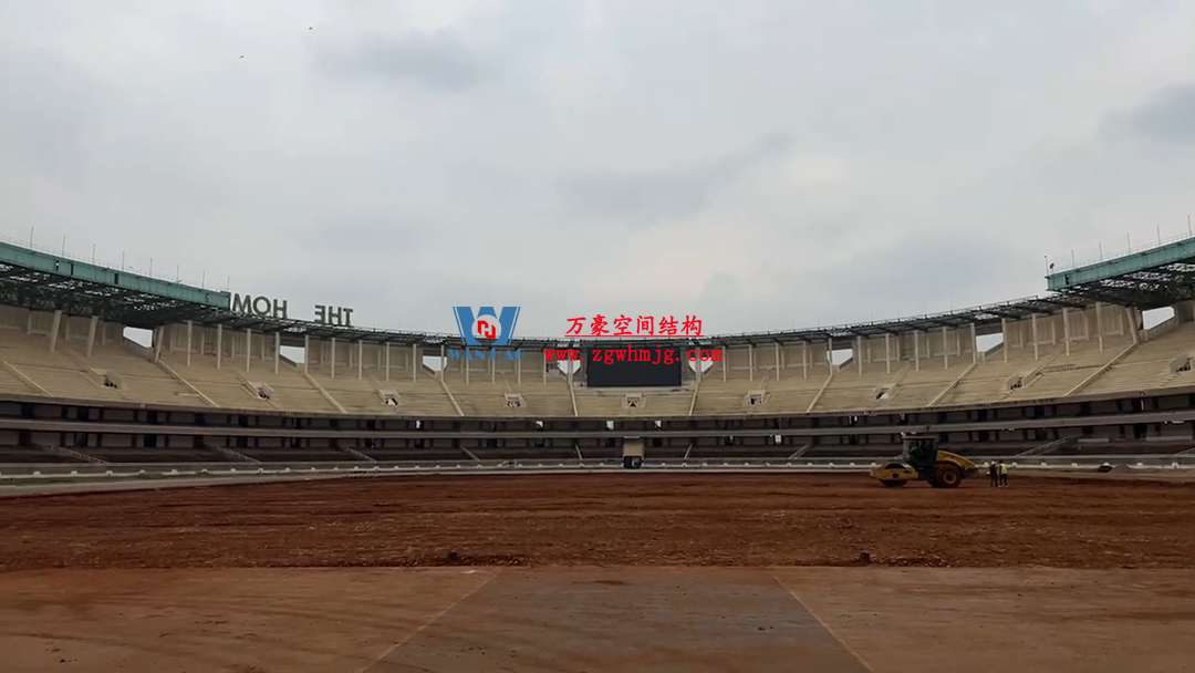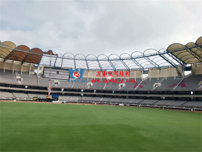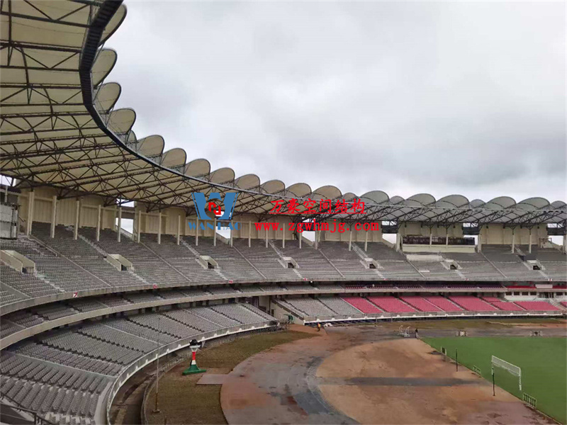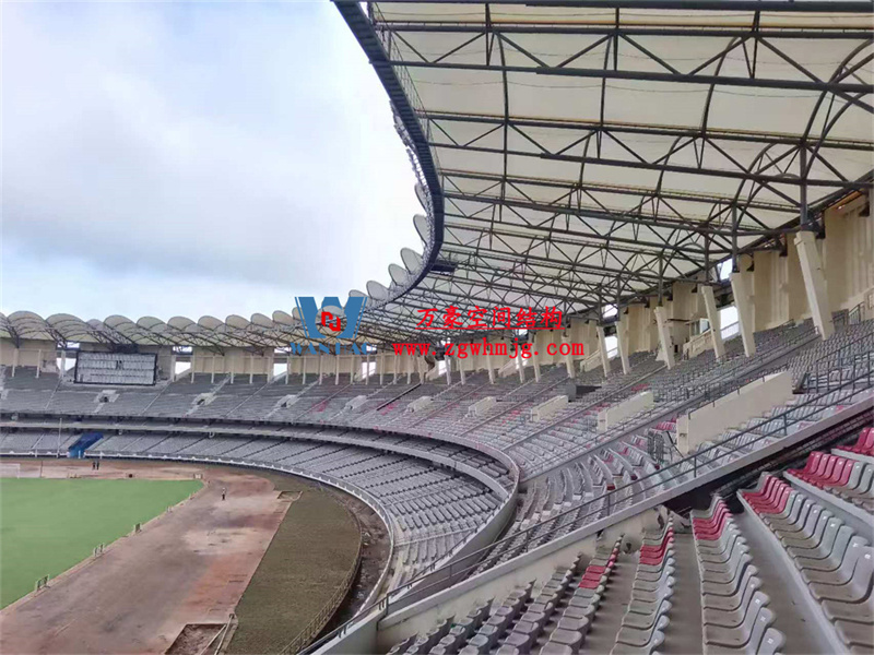 容纳3万人肯尼亚内罗毕(非洲杯)足球体育场,属于整体性改扩建项目,因体育场投入使用30余年,原设施落后陈旧,改造设计要求充分考虑原基础结构安全。项目前期需要进行基础立柱定位,结构屋面拆除等相关工作,并通过科学有效的技术措施处理,3D扫描,健康检测,建模分析等,经过多轮方案比选后,最终选择PTFE膜屋面大悬挑空间结构。主体桁架悬挑45米,横向联系向上起拱,屋面采用高自洁PTFE膜结构,开口式体育场内部视野空旷无遮挡,让非洲人民足球梦想在这里展翅高飞。该项目作为2026年非洲杯足球赛体育场之一投入使用,改扩建设计生产施工全部由萬豪团队完成,充分体现了萬豪的设计施工服务能力,也为海外市场的拓展奠定了扎实的基础。