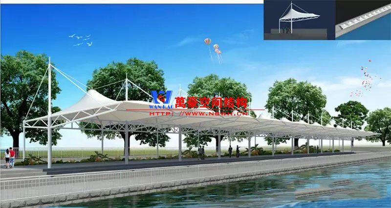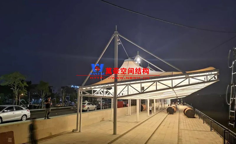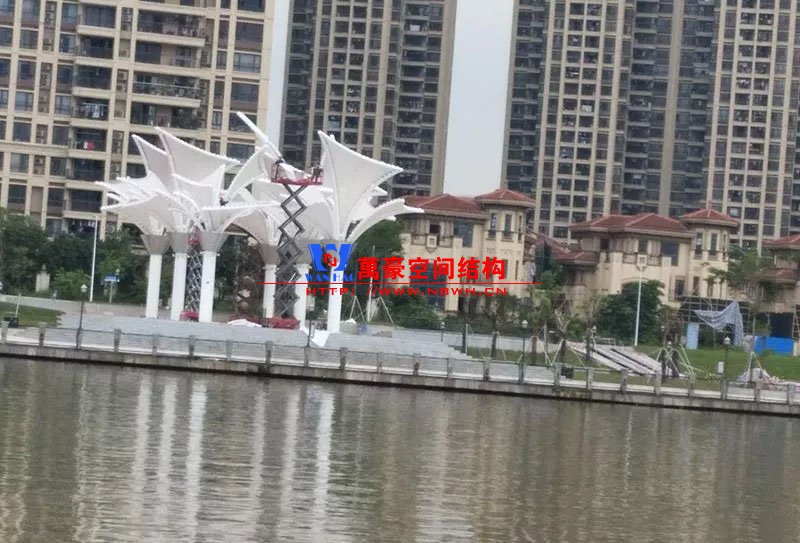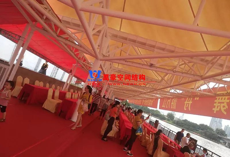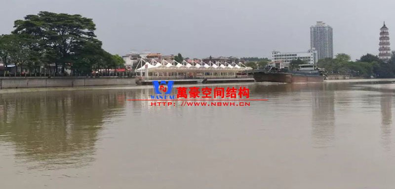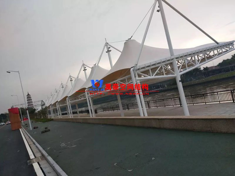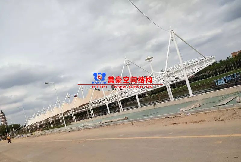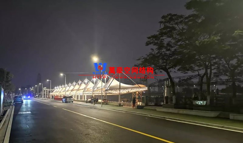 东莞东江西岸景观膜结构工程位于广东省东莞市,该项目是当地政府打造的重点工程,是为了宣扬中华传统文化龙舟节专门打造的,由宁波万豪空间结构工程有限公司中标承建。