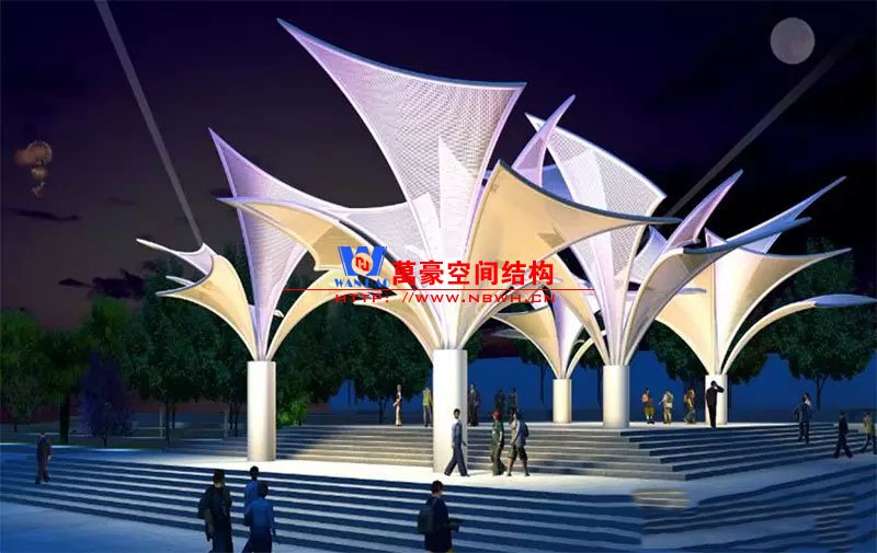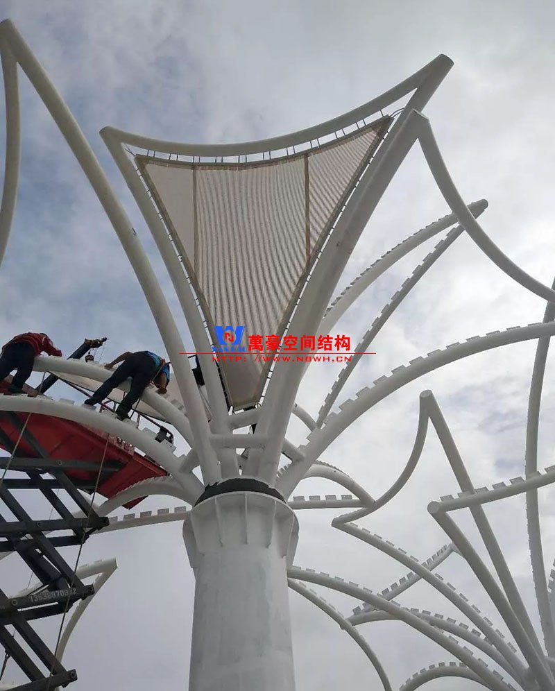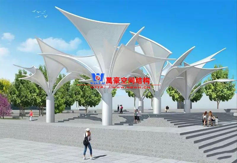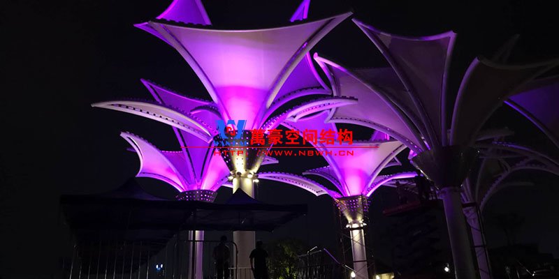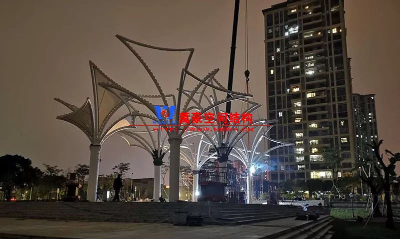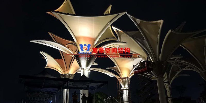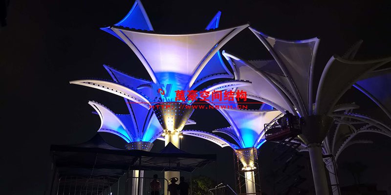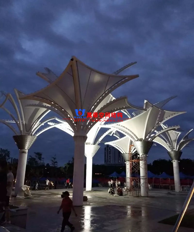 此工程项目主要分为两个部分,分别是龙舟主席台和广场龙舟广场景观膜。 其中主席台龙舟拉膜项目高度为7.25米,膜结构屋面材质为PTFE膜材。广场钢拉膜项目由六个龙船花造形景观组成,每个龙船花景观造形立柱的高度不得低于3.80米,花瓣造形最低高度 7.54米,花瓣造形最高高度9.608米,膜结构屋面材质为 PTFE网格基布双面贴透明ETFE建筑膜。
