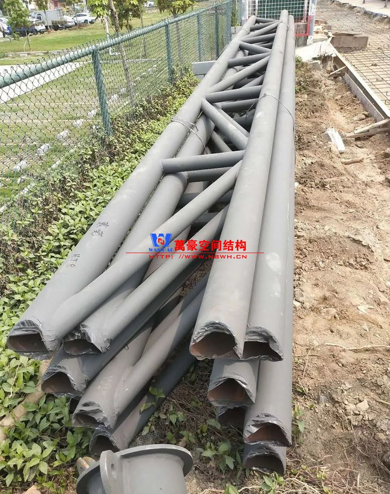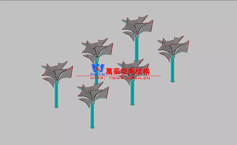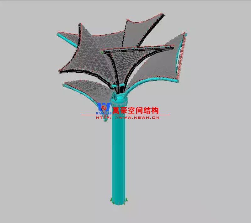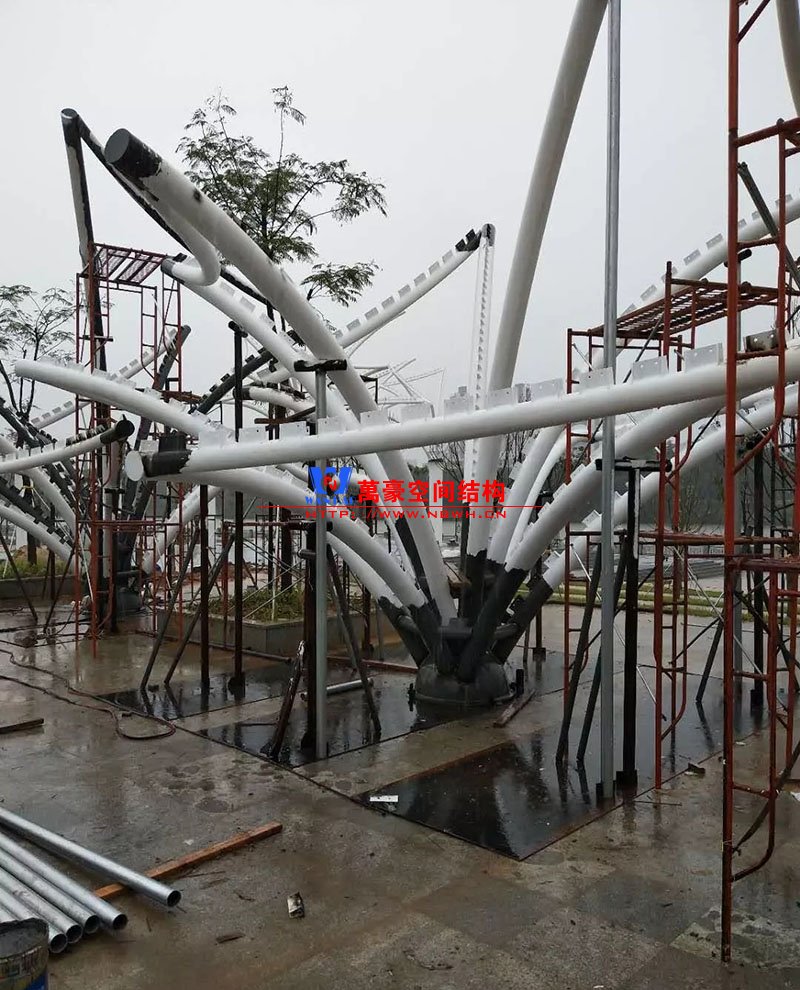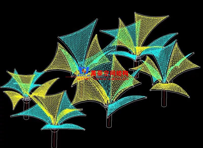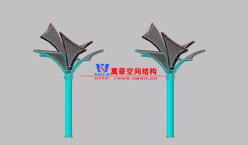此工程项目主要分为两个部分,分别是龙舟主席台和广场龙舟广场景观膜。 其中主席台龙舟拉膜项目高度为7.25米,膜结构屋面材质为PTFE膜材。广场钢拉膜项目由六个龙船花造形景观组成,每个龙船花景观造形立柱的高度不得低于3.80米,花瓣造形最低高度 7.54米,花瓣造形最高高度9.608米,膜结构屋面材质为 PTFE网格基布双面贴透明ETFE建筑膜。