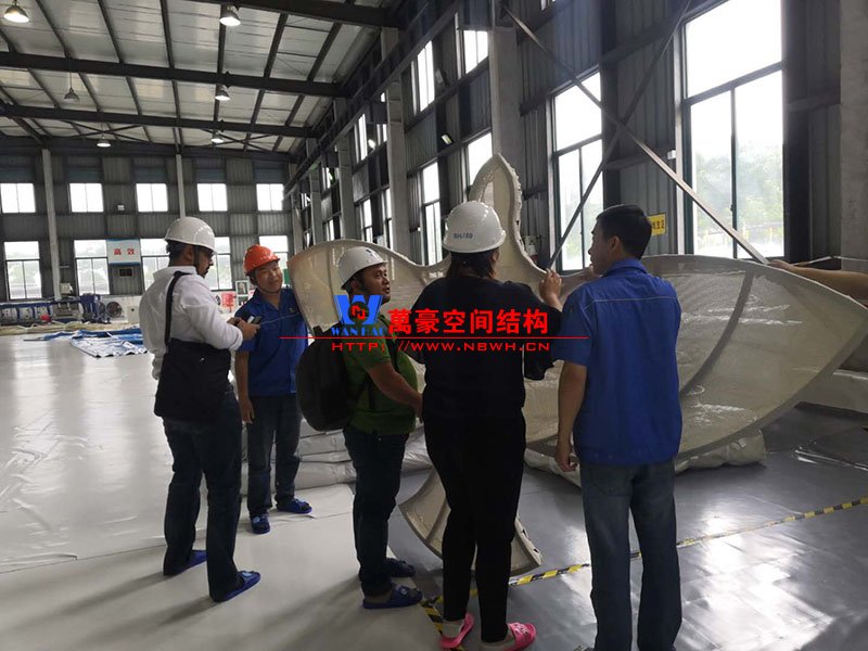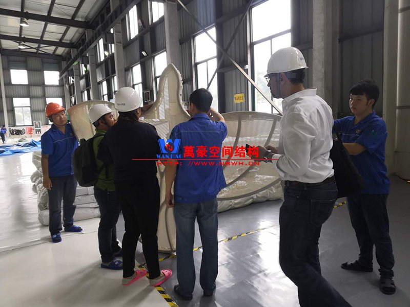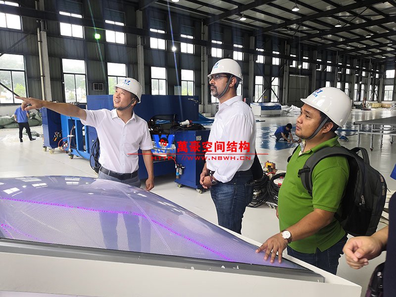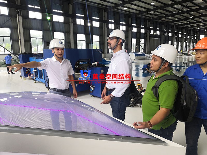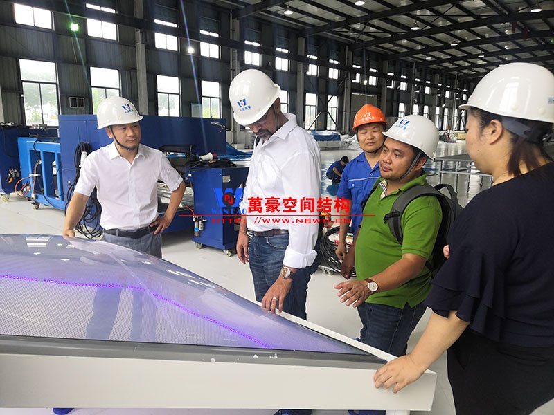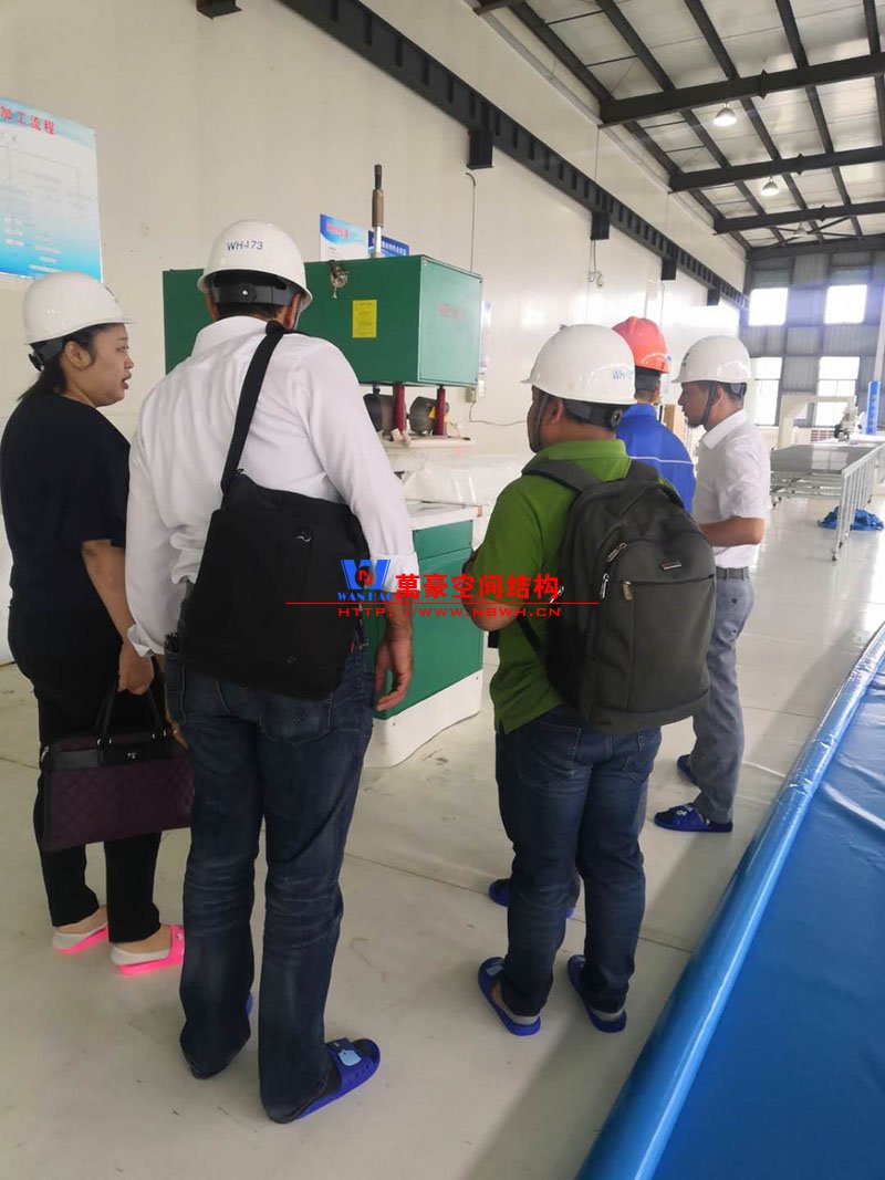2019年6月13日,迪拜客户来我司工厂进行实地参观考察。 优质的产品和服务、设备和技术,良好的行业发展前景,是吸引此次客户到访的重要原因。 公司总经理张总及各相关部门负责人热情接待了远道而来的客人。 首先,我们和客户在万豪会议室进行了技术交流。 然后,我们陪同迪拜客户参观了公司膜结构生产车间。 在参观过程中,张总给客户进行了详细的产品介绍,并对客户提出的疑问进行了专业解答。丰富的专业知识和有素的工作能力,也为客户留下了深刻印象。 随后,我们向客户展示了他们需求的膜结构样品,产品得到了客户的高度评价。 最后,双方就未来合作进行了深入探讨,希望未来在合作项目中实现双赢、共同发展。