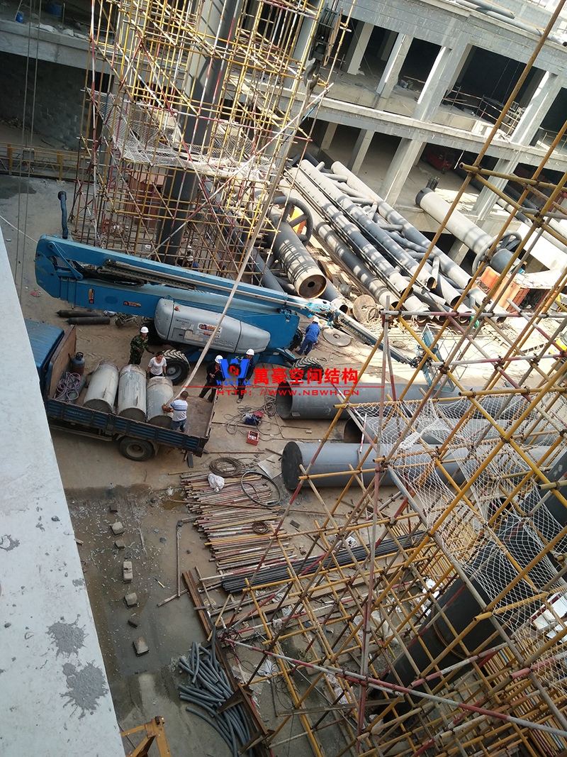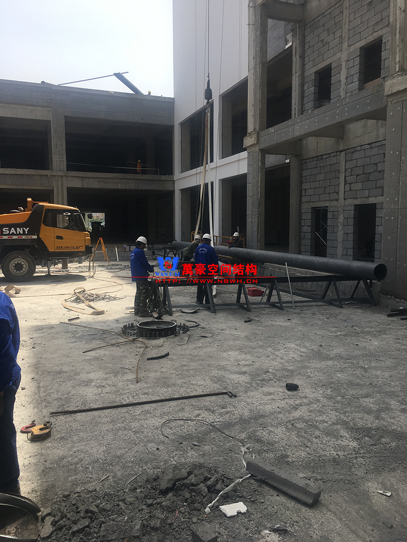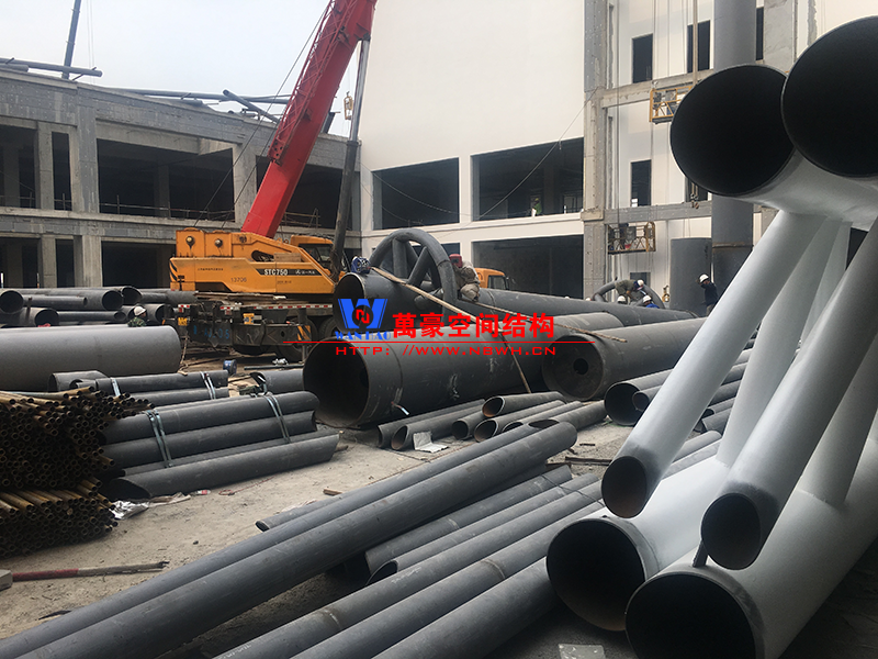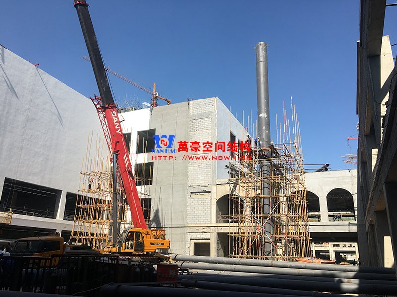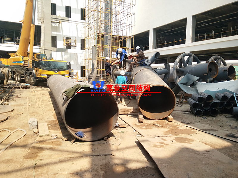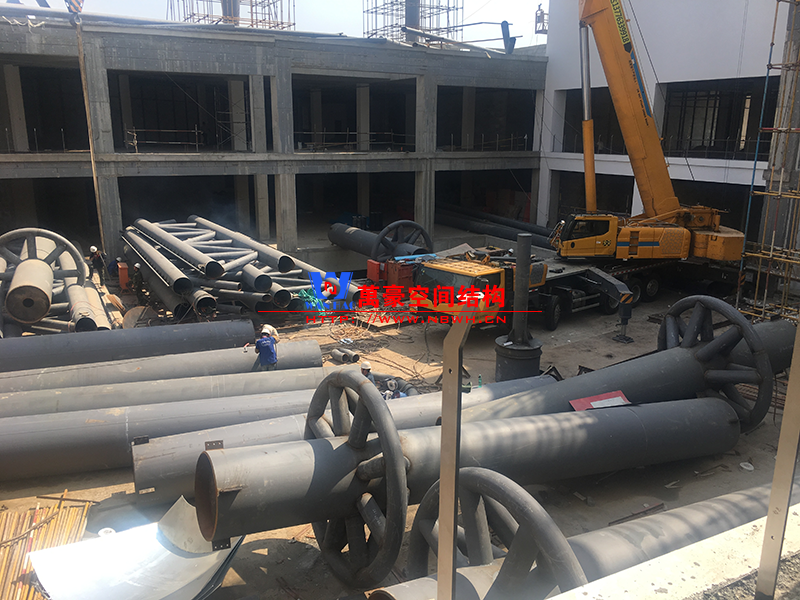 目前一号云朵钢柱立起3根,悬挑管架全部拼装完毕,桁架拼装完成;二号云朵钢柱立起3根,桁架、漏斗已基本到位,悬挑构件焊接中;三号云朵钢柱焊接中,隔板、环板正在有序拼装。