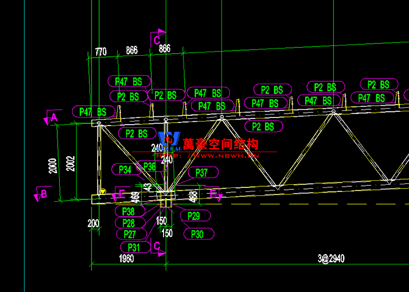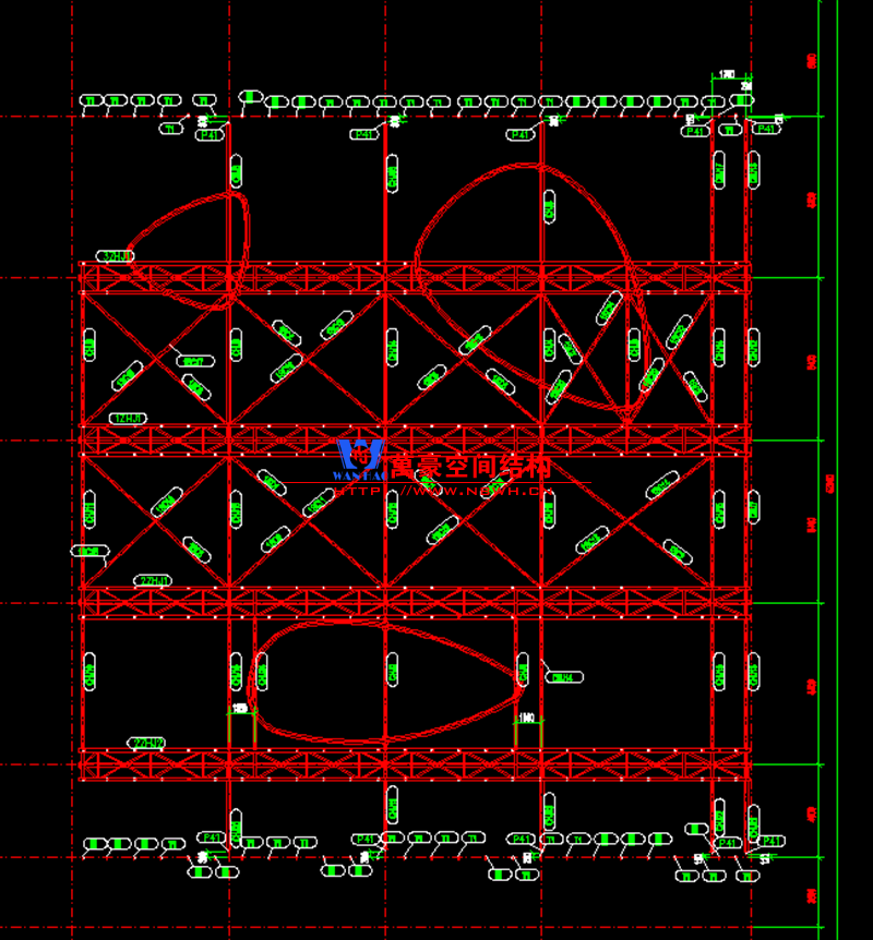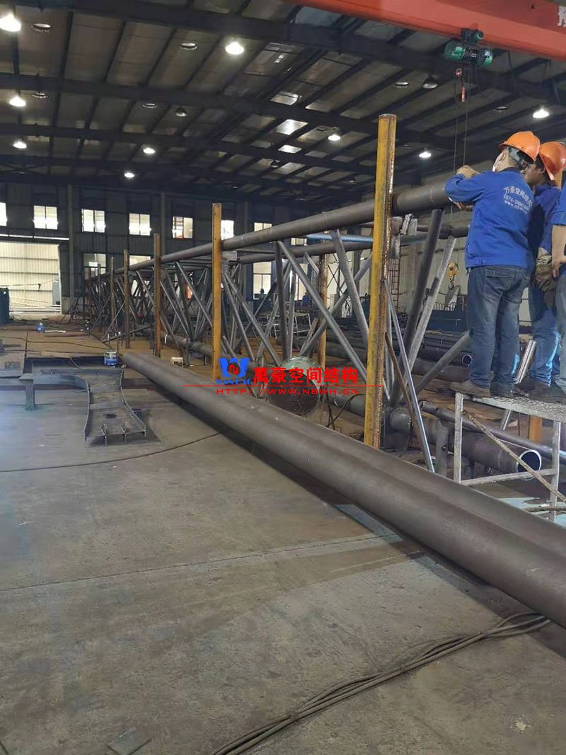 该项目用钢量60多吨,桁架跨度35.2米,主桁架高度2米,腹杆斜撑2.2米。