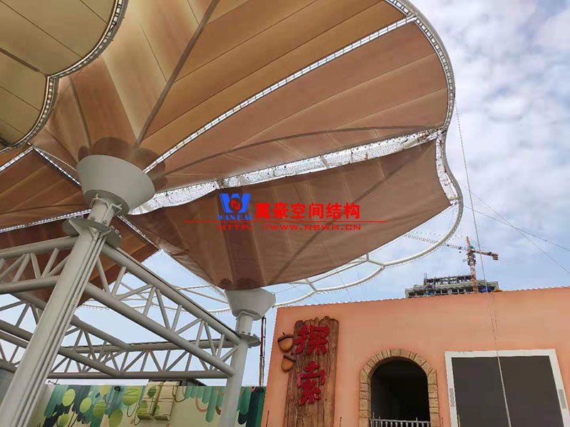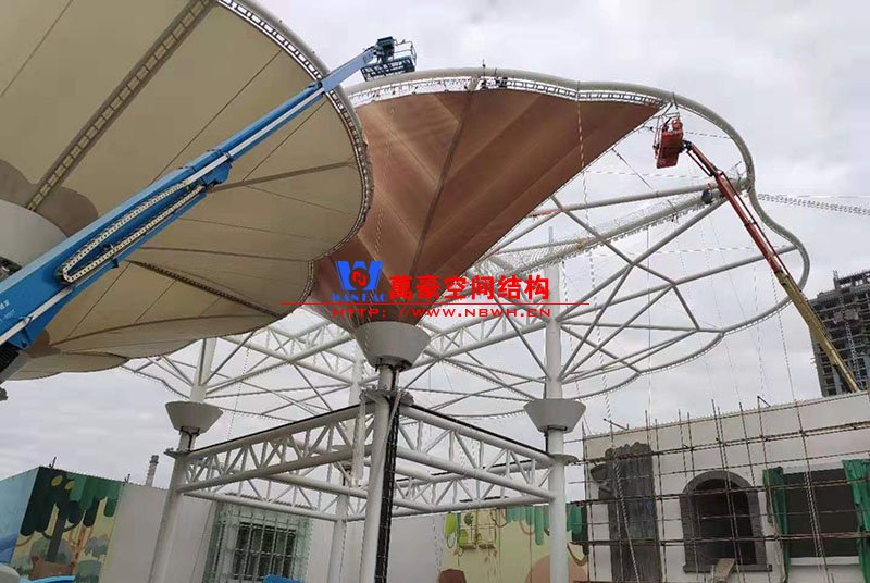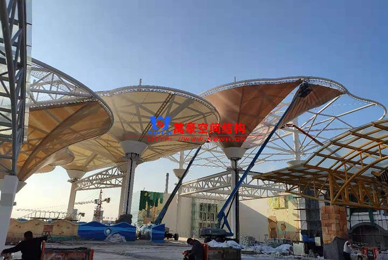 聊城欢乐小镇七彩云朵膜结构项目位于山东省聊城市卫育路东香江路北万达广场内,该工程由宁波万豪空间结构工程有限公司承建。 该项目设计思路沿用了上海世博轴的倒伞形状,其中最大的一个伞形面积达8000平米,工程共计用钢1500吨,膜结构展开面积3万平米,是钢、膜、索结合真正意义上的大型索膜结构。