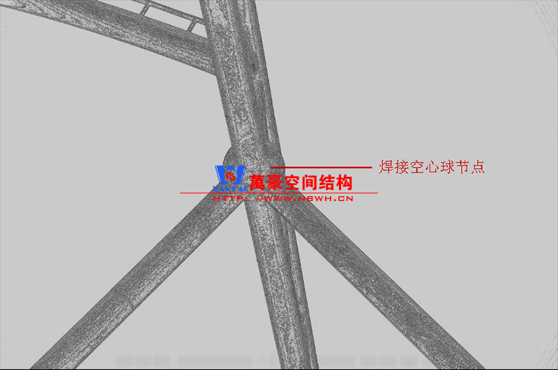 次梁延长桁架与“V”型支架的节点形式为管球节点,整个管球节点是钢屋盖结构中最关键的构件之一,与“V”型支架呈单幅式三角形。其下部“V”型支架与预埋牛腿连接,径向次梁桁架与主立柱连接。其中,焊接空心球与“V”型支架节点先作为临时固定焊缝使用。