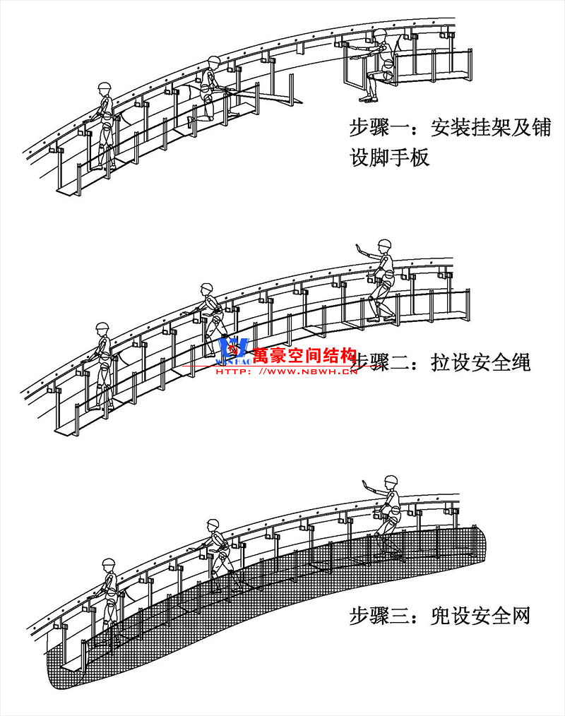 ⑷ 护栏及防晃纤绳安装:用插接方式加高挂架外侧立管并在立管上用大绳绑固两道护身安全绳;每隔五个挂架拉一对防晃纤绳与二次部材筋板拉结。