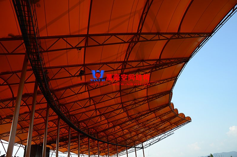 梦幻谷“暴雨山洪”看台为骨架支承式膜结构。骨架钢结构由15榀主桁架和154根弧管组成,采用圆钢管制作。
