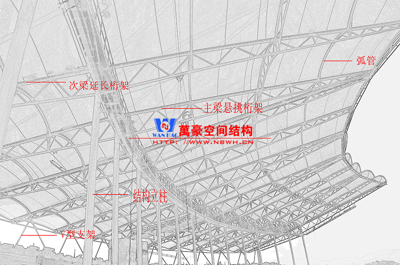 主桁架之间用弧管连接,弧管起着调整各主桁架间的内力分配,同时作为主桁架的侧向支撑,传递侧向水平荷载、提高整体结构的稳定性。弧管呈矢高1m~1.5m的拱形,能更好的支撑膜面,使之更具备自排雨、雪的功能。