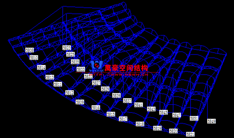 该工程膜结构及相应的支承结构,均是以内部主体结构为承载体,通过膜体及相关的结构支承。选用3S3D11.0设计软件进行分析,计算简图见图II-19-8。考虑恒荷载0.01KN/ m2,风荷载0.55KN/m2 ,雪荷载0.35KN/m2 ,活荷载0.3KN/m2。