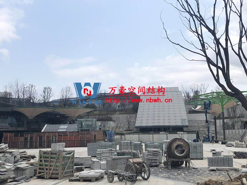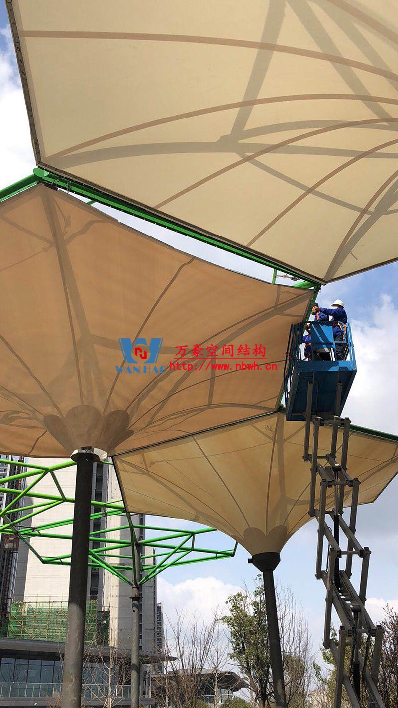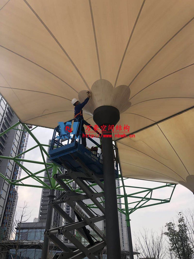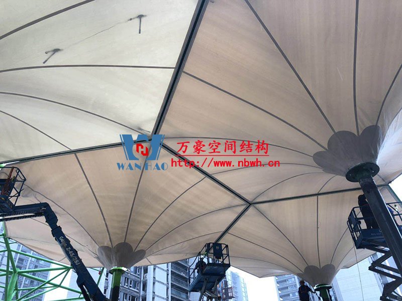 五乡地铁站伞状PTFE膜结构工程位于浙江省宁波市杨柳郡,项目由19座倒伞膜结构组成,倒伞寓意盛开的牵牛花。 该项目膜材使用进口PTFE膜材,膜结构展开面积5000平米,用钢量100吨,由宁波万豪空间结构工程有限公司承建。 目前,该工程进入膜结构安装阶段。期待整个工程的完工,来领略它独特的风采。