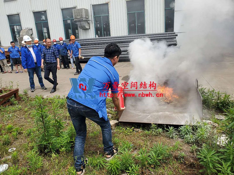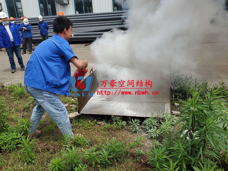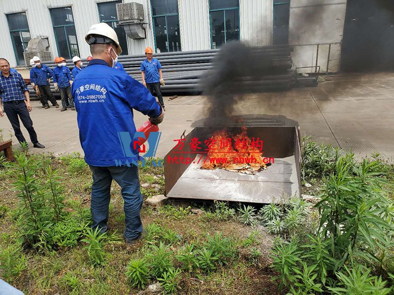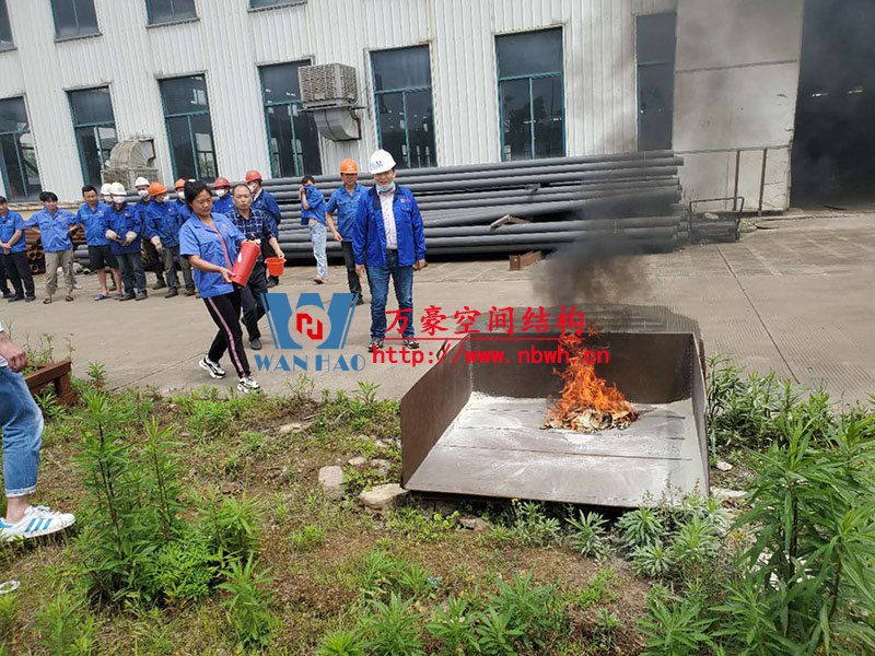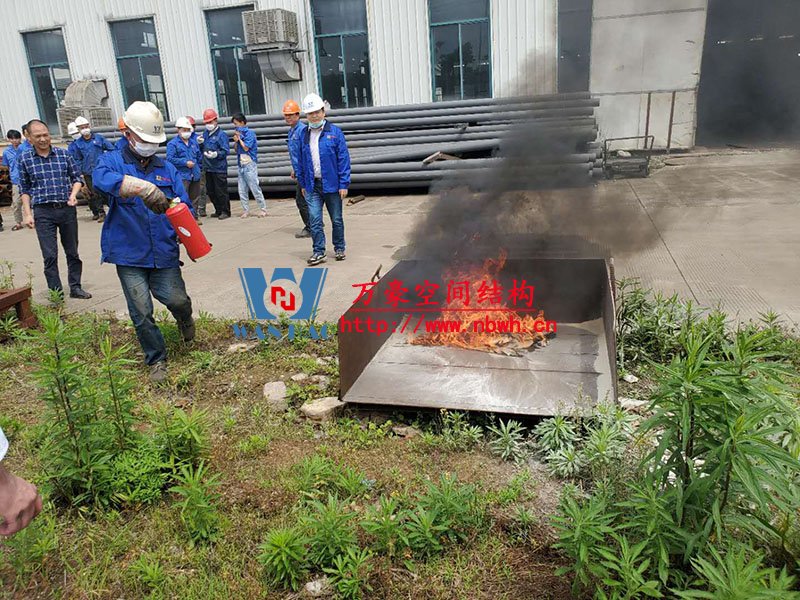 为贯彻国家的安全生产方针,落实安全生产责任制,响应国家第十九个安全生产月 “消除事故隐患,筑牢安全防线” 的活动主题,贯彻落实“预防为主,防消结合”的消防方针,进一步强化公司员工的消防安全教育,提高火灾防控能力和突发事件应变能力,学会正确使用灭火器和消防设备设施,我司于2020年5月22日在公司举行“防火防爆应急演练活动”。 一、演练范围: 本公司范围内员工、应急救援小组及救援人员。 二、演练类型 疏散、消防、救援等实地演练。 三、演练地点 万豪膜结构工厂 四、演练时间 2020年5月22日下午 五、演练内容 发现期:车间堆放的木托架遇明火突发火灾,现场第一发现人员呼叫两名作业人员开展现场急救灭火; 蔓延期:火势呈蔓延势态,发现人员拨打公司救援电话,公司应急小组响应后赶赴现场,开展应急救援。 六、演练结果 成功控制火灾,演练活动圆满完成。