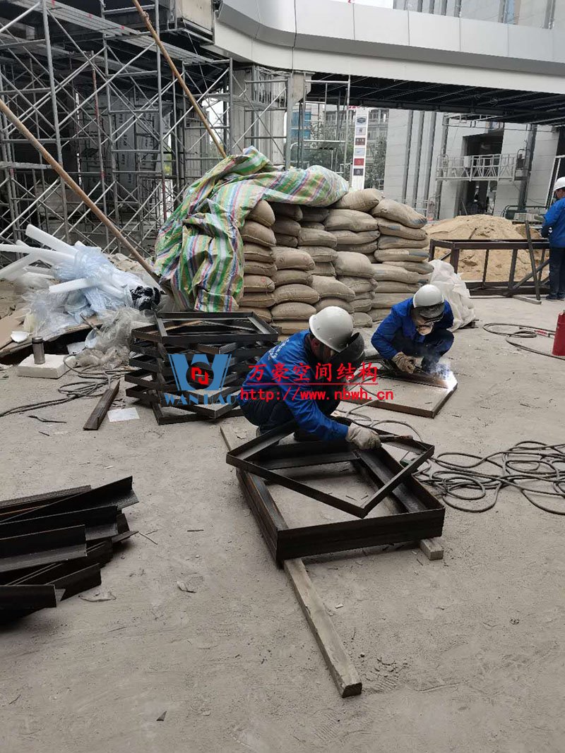 [卓越•财富广场]是新泰市重点打造休闲,娱乐,商务,五星级酒店于一体大型城市商业综合体。建筑面积约6.5万平方米,总投资约3.5亿元人民币。是新泰市投资和建筑面积最庞大的商业综合体项目,是新甫社区招商引资,新泰市政府重点招商项目。 其中,新泰卓越·财富广场膜结构屋顶项目由宁波万豪空间结构工程有限公司承建。 项目区域划分为A区,B区,C区,其中C区不满足施工条件,先进行AB区的安装。目前,AB区牛腿施工完成,拉拔实验已合格完成,按流程进行后续柱子安装,A区钢结构开始安装。