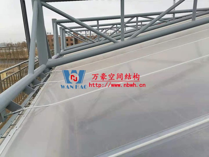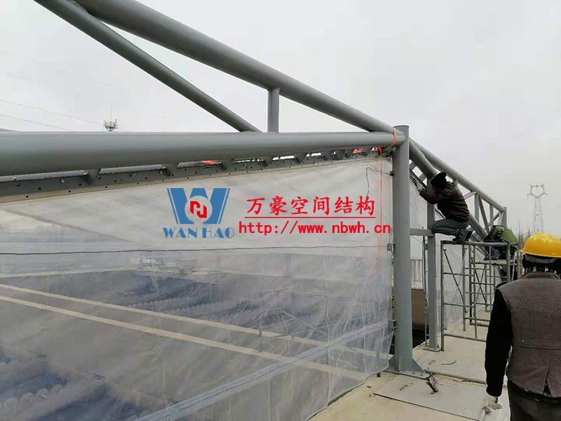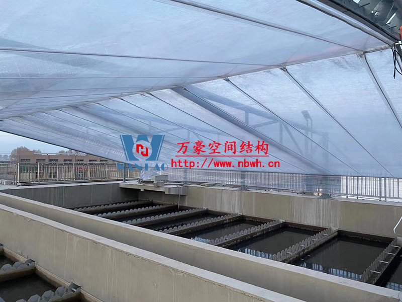 格尔木工业园昆仑工业区工业污水厂污水池保温膜结构工程位于海西蒙古族藏族自治州格尔木市,由宁波万豪空间结构工程有限公司承建。 该工程主要建设格尔木工业园昆仑工业区工业污水处理厂首期2.5万立方米/天工程二沉池、水解酸化池和预沉池池体保温膜结构安装。项目用钢量230吨,膜结构展开面积5000平米。 本项目是国内首个采用高品质ETFE膜材料作为反吊污水池材料使用的工程。ETFE膜材料俗称软玻璃,具有95%透光率,可以直接替代玻璃使用,更具有自重轻盈、柔软可张拉,对结构要求较低等特点,对污水处理池要求的阳光和紫外线照射起到很好的作用。 目前项目膜结构安装中,期待最终效果的呈现。