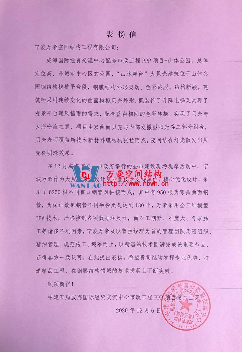 特此中建五局威海国际经贸交流中心项目部致以感谢信与定制锦旗给与嘉奖。
