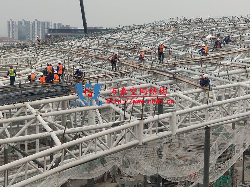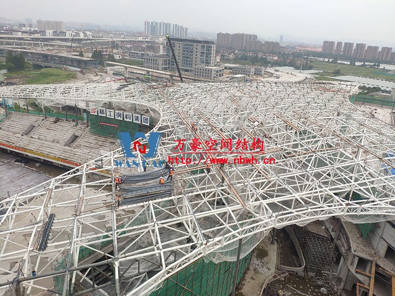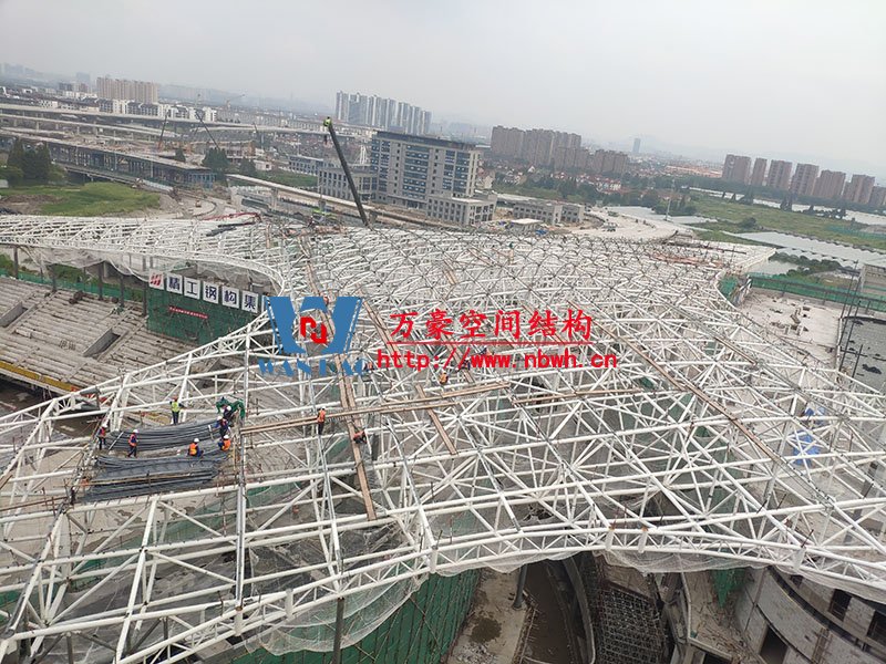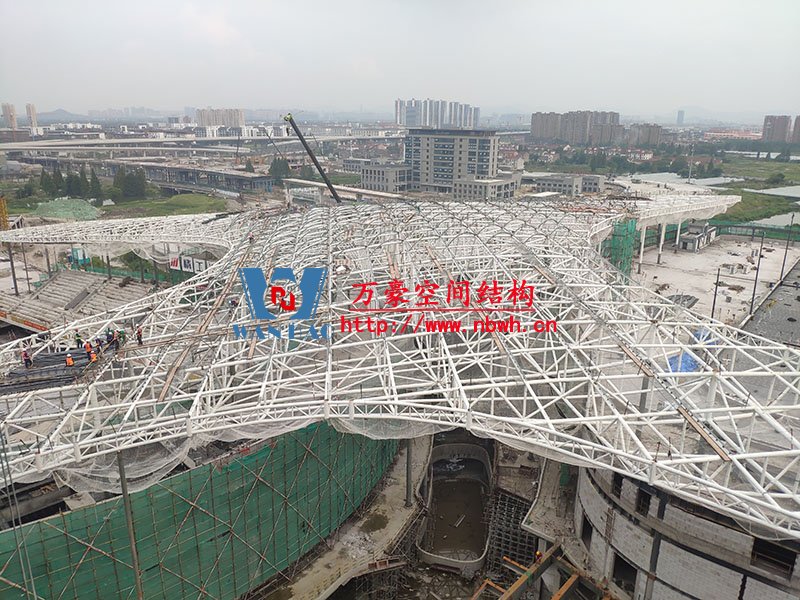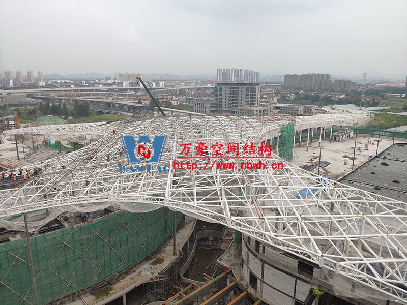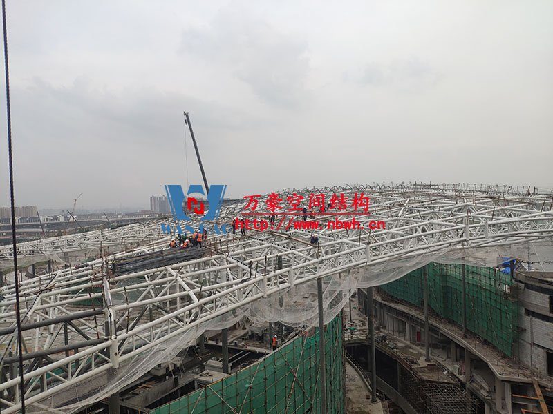 项目一共分六区,目前,一区钢构件安装完成,二区拉膜板安装完成,拱杆完成50%。整体拱杆安装完成45.6%,拉膜板安装完成53.6%。