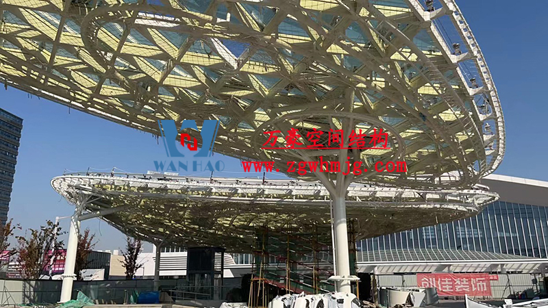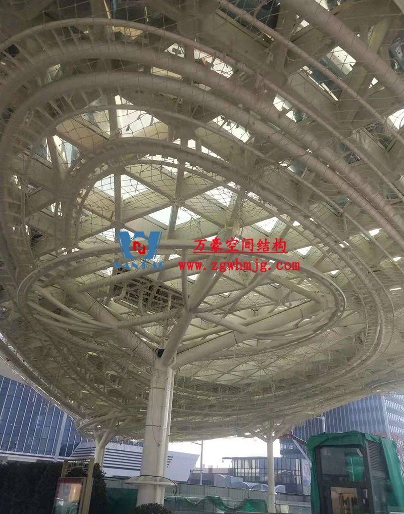 本工程钢结构为单层双曲网壳结构体系,平面上为对称结构,大翅膀长跨约 50m,短跨约 25m,小翅膀长跨约 35m,短跨方向约 15m。建筑顶面为双曲造型,建筑物最高点标高约17米。总用钢量800吨,膜体总面积约7000平方米。