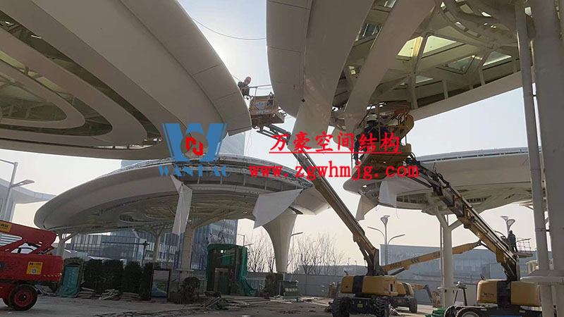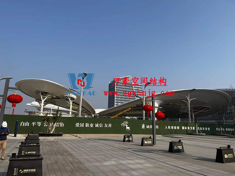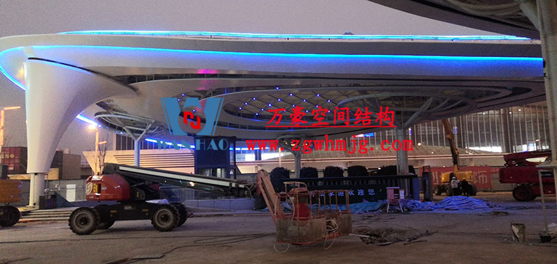 张家港高铁站前蝴蝶造型天幕工程双曲面空间钢结构结合膜结构结合幕墙结合灯光呈现出来现代建筑工艺多元化组合化。