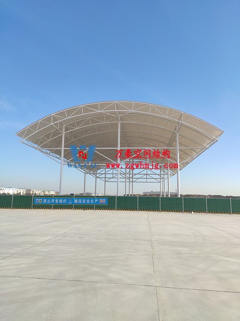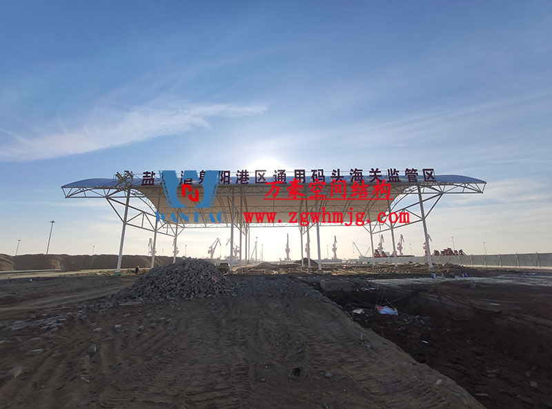 射阳港港区国家一类开放口岸一关两检查验设施项目位于江苏省盐城市射阳县临港工业园区,用钢量150吨,膜结构展开面积3000平米,由宁波万豪空间结构工程有限公司承建。