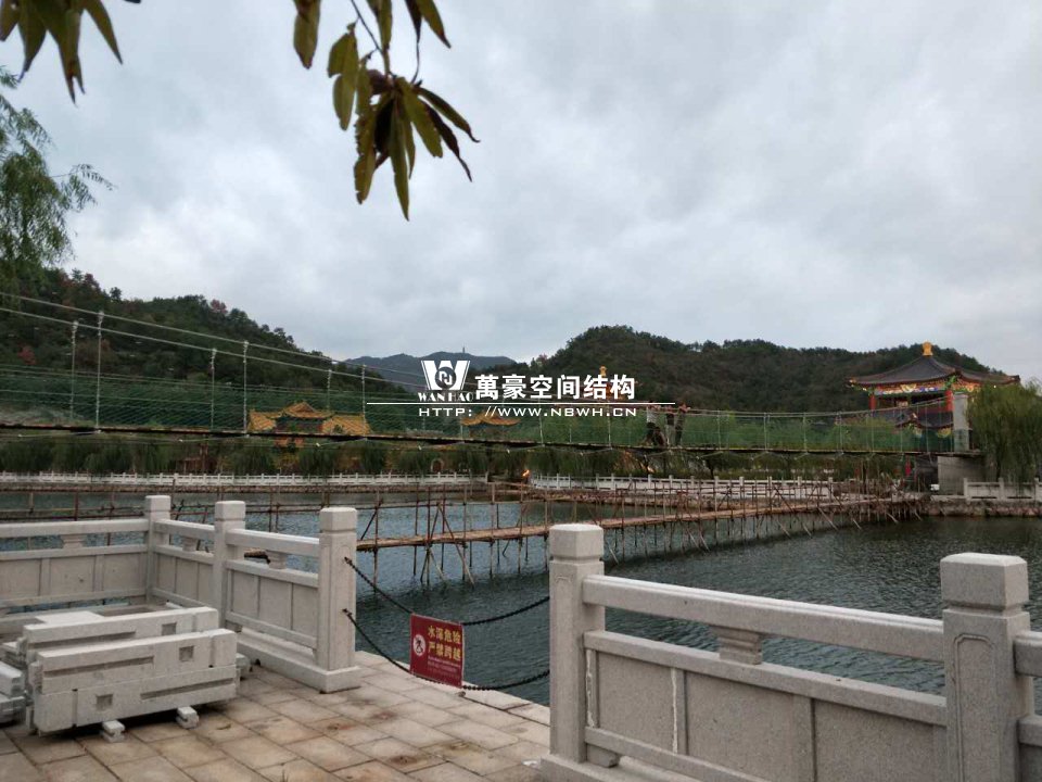 春苑南屏晚钟铁索桥工程(悬索桥)项目呈现于一座别具文化优秀造园艺术,融中华文化与世界多元化于一体的辉煌壮丽的百年巨作横店圆明新园内。桥身直跨景湖两岸,像一条飞虹。桥两头“河畔多杨柳,追游尽狭斜”与圆明新园融合一体。