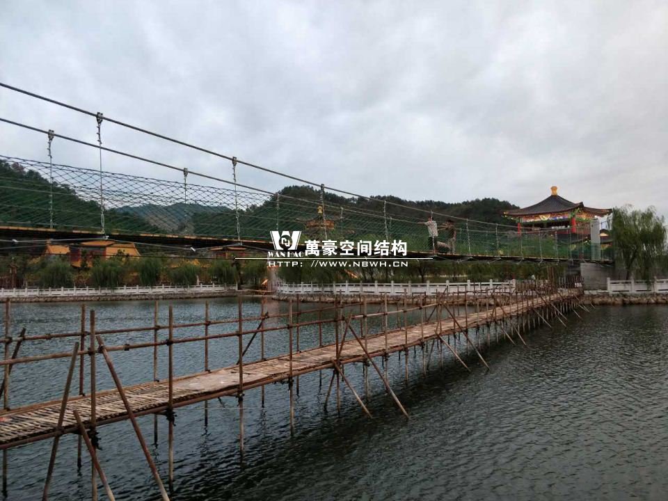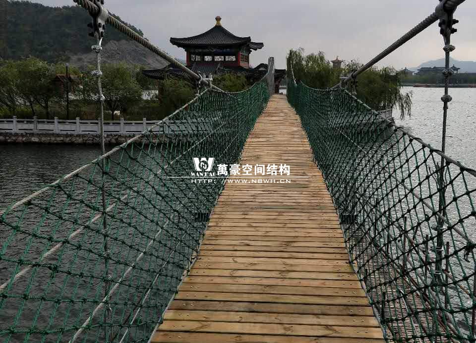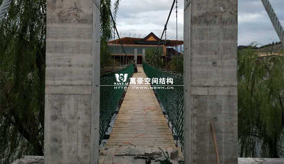 该桥采用8根柔性钢丝绳,4支立柱作为受力构件,桥面采用组合型钢作为支撑面,上铺防腐木枋板。根据桥面与水位的相对高程,吊桥主跨为65m。该桥桥面净宽度为1.5m,吊桥桥面总宽度2.0m。上铺4公分厚的防腐木枋板。最多可承受130人行走,桥下能自由通行龙船。符合景区游客娱乐性游玩与功能性通行的完美结合在一起。