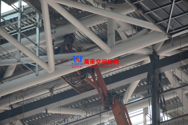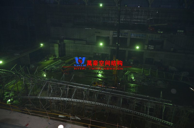 该膜结构由内外两部分膜组成,所有钢构件及膜材均采用吊顶反装式,主体结构高度达40米。施工现场吊装难度非常大,因采用PTFE材质内外膜,对整体钢结构精度要求非常高。我们现场钢结构施工过程中均委派专业计量人员及质检人员全程参与数据实时复核以提高精确度。因本项目作为青岛市标杆项目,工期急,工艺要求高,我司作业人员基本采用24小时轮班工作制,节假日全部无休,只为早一天将此项目顺利竣工交付给业主单位。