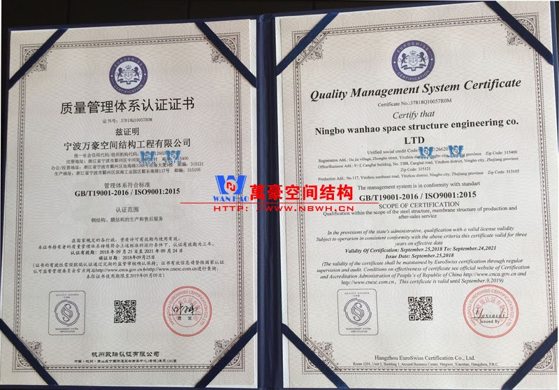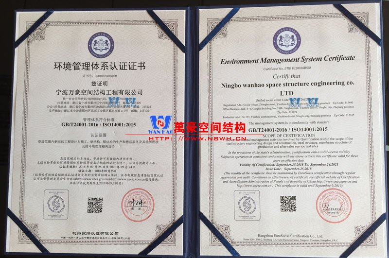 最近,宁波万豪空间结构工程有限公司进行了最新一次的质量管理体系认证审核,各项指标自然是符合要求,顺利的拿到了4项管理体系认证证书,大家可以见证一下。